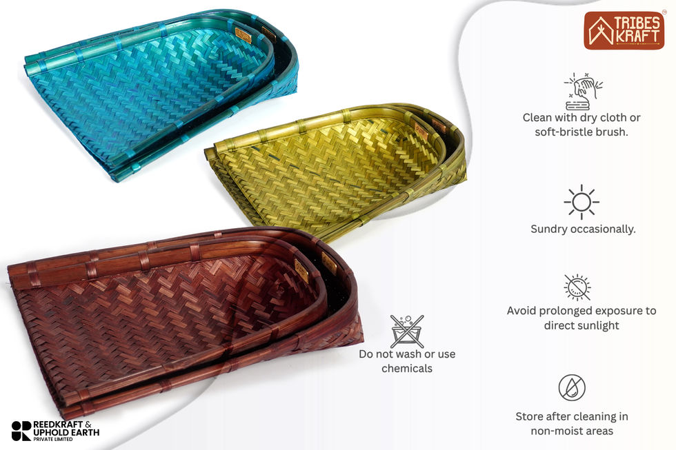 | The TRIBESKRAFT Bamboo Soop/ Winnowing Tray is handwoven, and designed for both function and elegance. Its classic design and size (17x14x3.5(H) inches) make it very functional and stylish. The blue color complements modern as well as traditional interiors, while the nesting design allows multiple trays to be stored compactly when not in use. Durable yet lightweight, this soop / winnowing tray adds an organic touch to kitchen and winnowing spaces (and also perfect for Chhath Puja). TRIBESKRAFT is a brand of Reedkraft & Uphold Earth. Our bamboo products are crafted by skilled artisans in India, who carry forward centuries-old weaving traditions. Their expertise in working with natural fibers ensures not only strength and beauty but also a production process that is largely carbon-neutral. These products are handcrafted and made from natural materials; hence, minor variations of up to 10% in colour, texture, shape, and size may occur. Each handcrafted product bears the subtle marks of artisan handiwork, setting it apart from mass-produced alternatives. Bamboo, known as “green gold,” is one of the fastest-growing renewable resources in the world. It matures quickly without the need for pesticides, making it a sustainable choice for eco-friendly living. Its natural strength, flexibility, and elegance make it an ideal material for usage, storage and décor. This bamboo soop / winnowing tray is a perfect blend of practicality and sustainability—a conscious choice that aligns with modern minimalism while reducing reliance on plastic and other non-biodegradable materials. Join us in the journey of creating a sustainable planet. TRIBESKRAFT products have up to 60% less CO₂ emissions compared to conventional plastic, metal, or synthetic alternatives. Every purchase you make contributes directly to artisans, rural communities, and reducing the Carbon footprint. Your choice matters! |