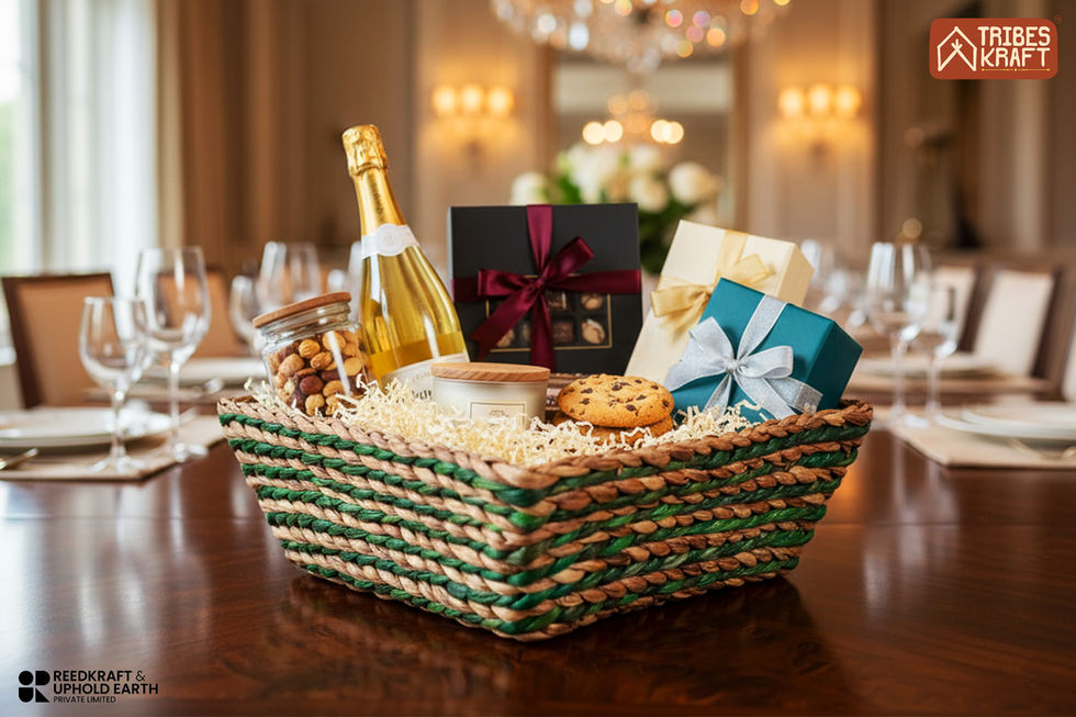 | Handcrafted with care, the TRIBESKRAFT Water Hyacinth Gift Hamper Basket, measuring 10 x 10 x 3.5 inches with a dual natural & green finish and square shape, is the perfect gift hamper basket for the eco-conscious. It combines sustainability with contemporary elegant design, durability, and affordability. Made from high-quality, natural water hyacinth, this basket is durable, lightweight, and showcases a rustic yet refined charm. Its spacious size makes it ideal for curating luxury gift hampers—whether for gourmet foods, dry fruits, teas, spa products, pooja materials, or festive assortments. Beyond gifting, it doubles as a versatile storage basket, adding a touch of organic beauty to your home décor. Ideal for weddings, festivals, and celebrations, it is a sustainable choice that reflects care and mindfulness. TRIBESKRAFT (a brand of Reedkraft & Uphold Earth) honors skilled Indian artisans who craft each piece using carbon-neutral water hyacinth weaving techniques passed down through generations. Water hyacinth, a rapidly growing aquatic weed, is ingeniously repurposed here to create sustainable, eco-friendly products. With minimal processing, toxin-free methods, and zero waste generation, each basket represents sustainability at its core. Our water hyacinth products embody durability, affordability, elegance, and eco-friendliness while generating up to 60% less carbon emissions compared to plastic, metal, and other conventional materials. Since these are handcrafted from natural fibers, slight variations (up to 10%) in colour, size, and texture are natural and add to the product’s uniqueness and charm. This product is a commitment to TRIBESKRAFT’s committment to eco-friendly living. Every purchase supports artisan livelihoods, rural communities, and a greener future. Fully biodegradable, it is a thoughtful, responsible choice for eco-conscious homes. Your choice matters—embrace sustainability with TRIBESKRAFT. |