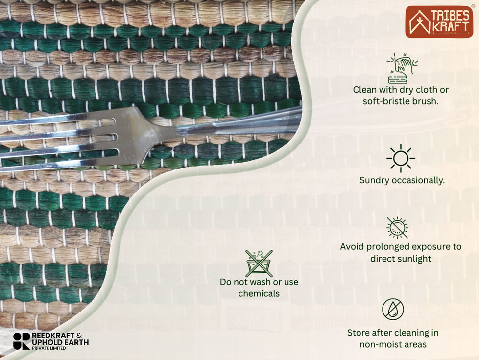 Bring the warmth of nature to your table with these beautifully handcrafted water hyacinth placemats, designed in a refined 18 x 12 inch rectangular shape. With their soothing dual finish (green & natural), they embody the perfect balance of earthy charm and timeless sophistication. Whether it’s a quiet family meal or a festive gathering, their understated elegance instantly enhances your dining experience. Lightweight yet sturdy, these mats safeguard your table from heat, spills, and scratches while remaining easy to clean with just a quick wipe. Each piece is meticulously woven by skilled Indian artisans and rural communities, keeping alive generations of craftsmanship and sustainable weaving traditions. Water hyacinth, a fast-spreading aquatic weed, is transformed here into something purposeful and beautiful. Known for choking rivers, blocking transport, and damaging aquatic habitats, this rapidly growing plant is ingeniously repurposed into durable, eco-friendly placemats. By weaving water hyacinth, artisans reduce its environmental harm while creating functional home décor that carries a lighter footprint—up to 60% fewer CO₂ emissions compared to plastic or synthetic alternatives. These mats are non-toxic, biodegradable, and made with minimal processing, staying true to TRIBESKRAT’s commitment to sustainable living. With every purchase, you support artisan livelihoods, rural communities, and a greener future. Affordable, natural, and enduringly elegant—our water hyacinth placemats embody the true grace of mindful living. |